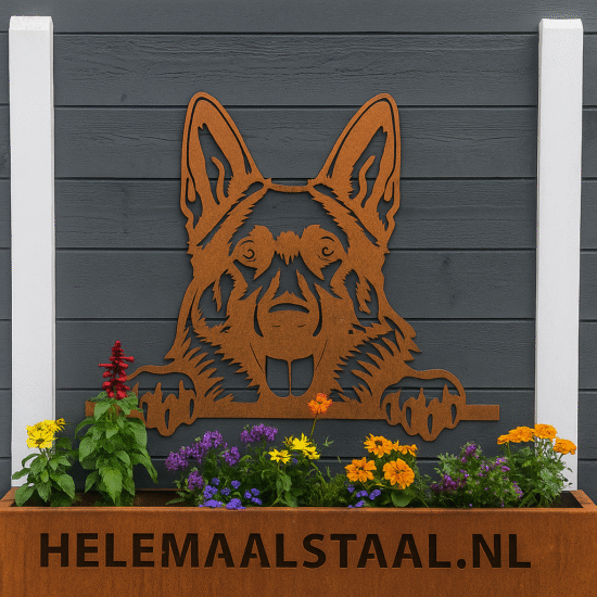Stoer, loyaal en waakzaam – deze Duitse Herder, laser gesneden uit 2 mm dik cortenstaal, is een krachtig statement in elke tuin of aan elke wand. Het gedetailleerde silhouet vangt de trotse houding en alerte uitstraling van dit iconische hondenras, perfect voor liefhebbers van karaktervolle decoratie.