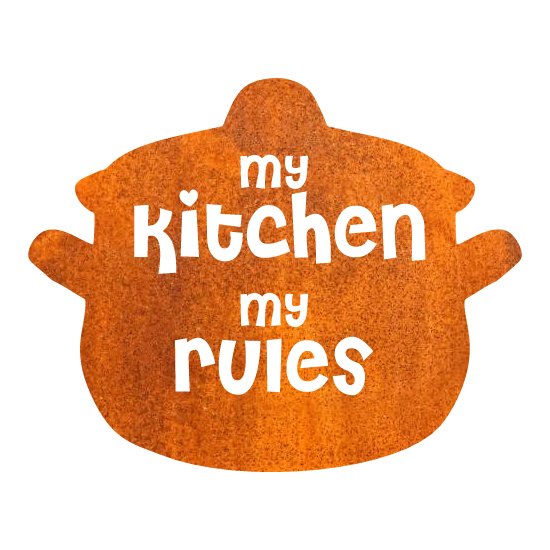 Breng een stoere en persoonlijke touch in je keuken met dit stijlvolle bordje van cortenstaal, waarop de tekst “My Kitchen Rules” scherp en strak is uitgesneden. Dit unieke decoratiestuk straalt karakter en zelfverzekerdheid uit, perfect voor iedereen die trots is op zijn of haar kookplek.